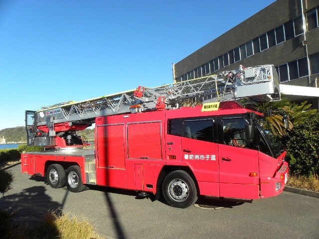 たて物10階にいる人たちを救出できる30m級はしご車!はしご車の先たんに付いているバスケットは、人が乗ることができるだけではなく、くっせつすることも放水することもできるんだ!